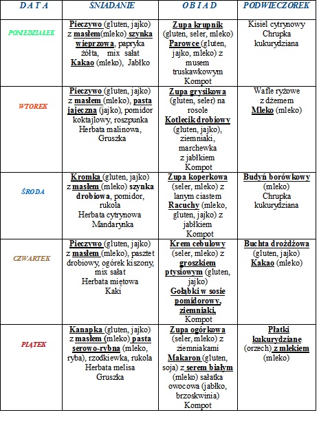 Alergeny zostały wyróżnione w jadłospisie poprzez pogrubienie.