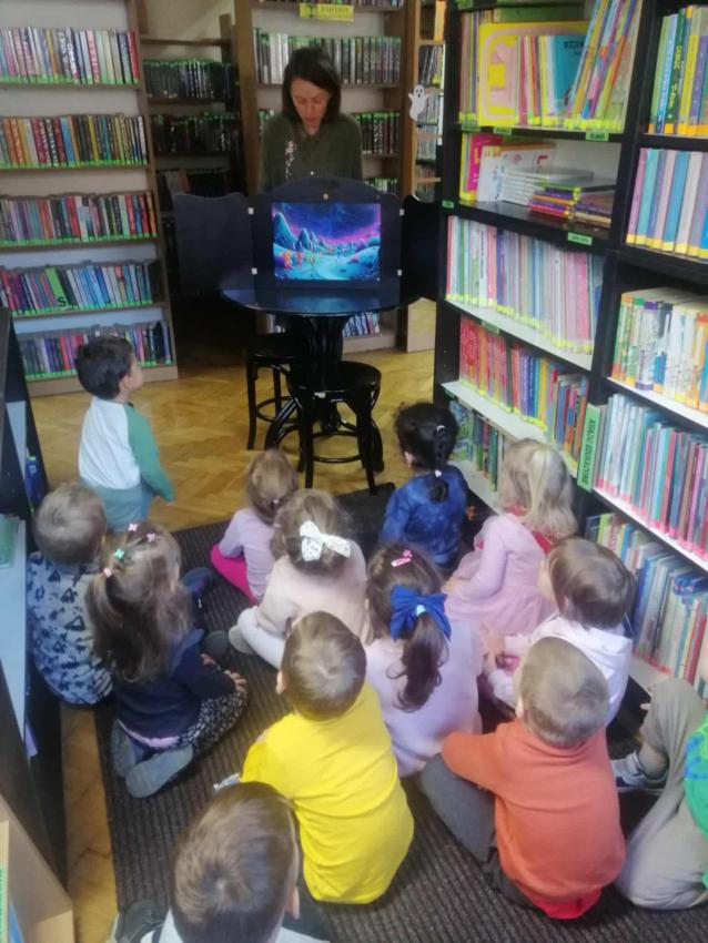 Podczas spotkania pani bibliotekarka opowiedziała dzieciom, jak wygląda praca w bibliotece, w jaki sposób można wypożyczać książki oraz jak należy o nie dbać.