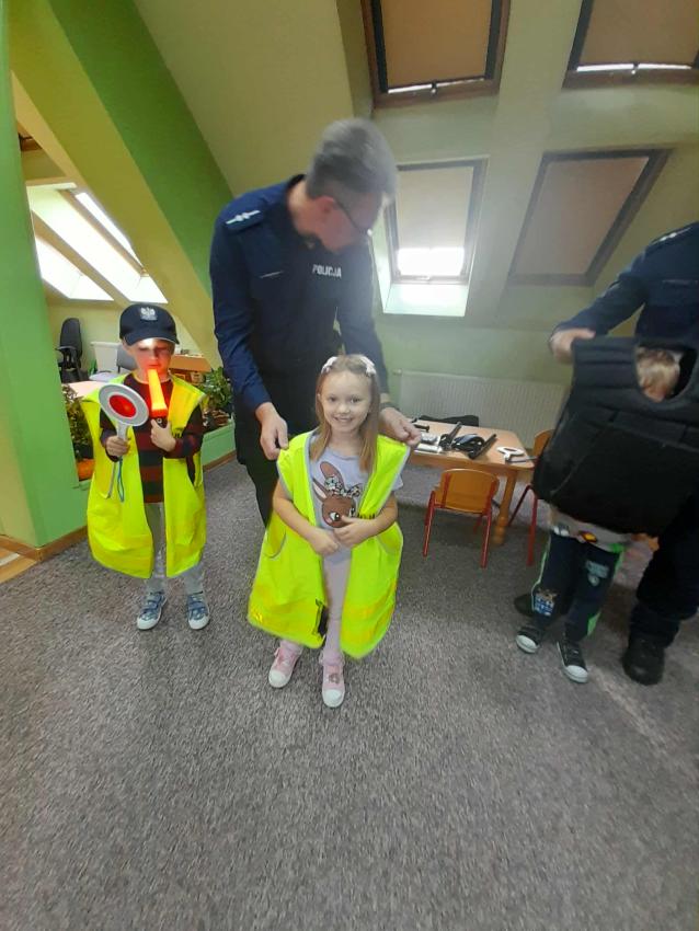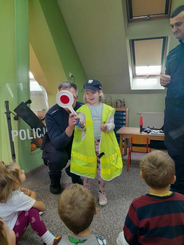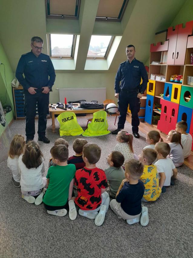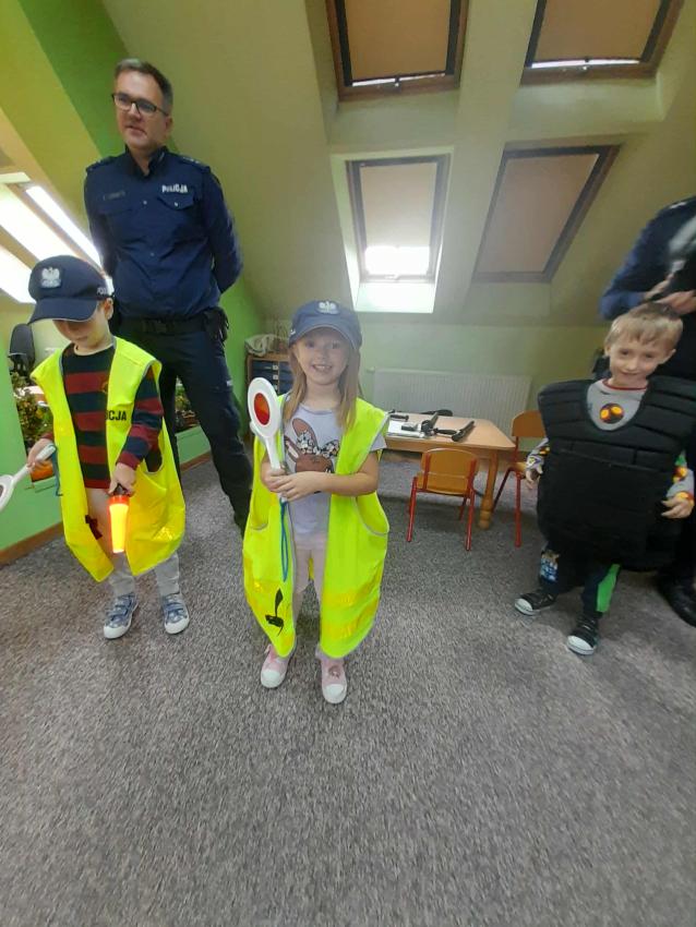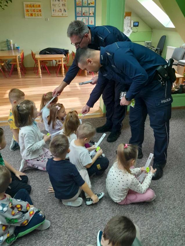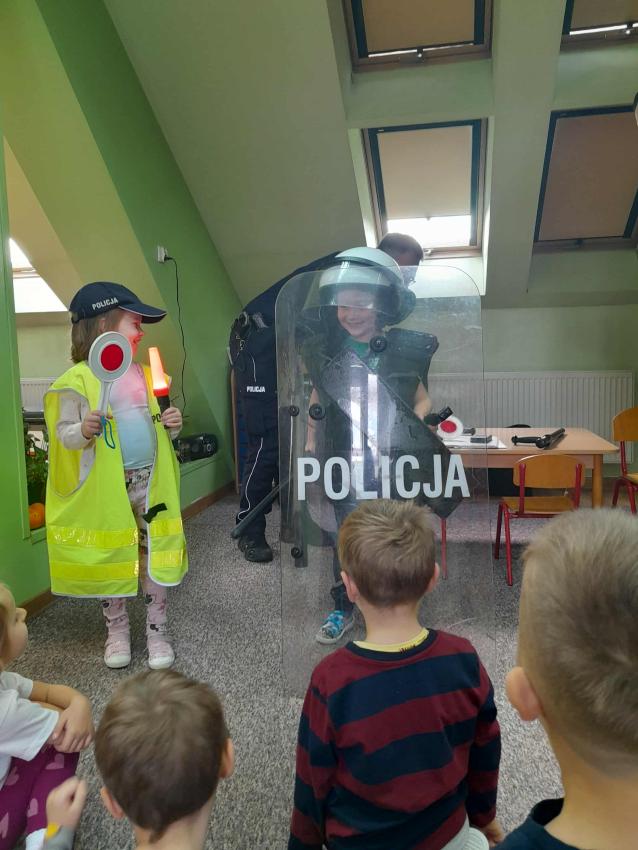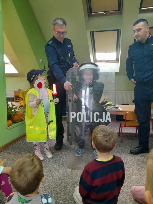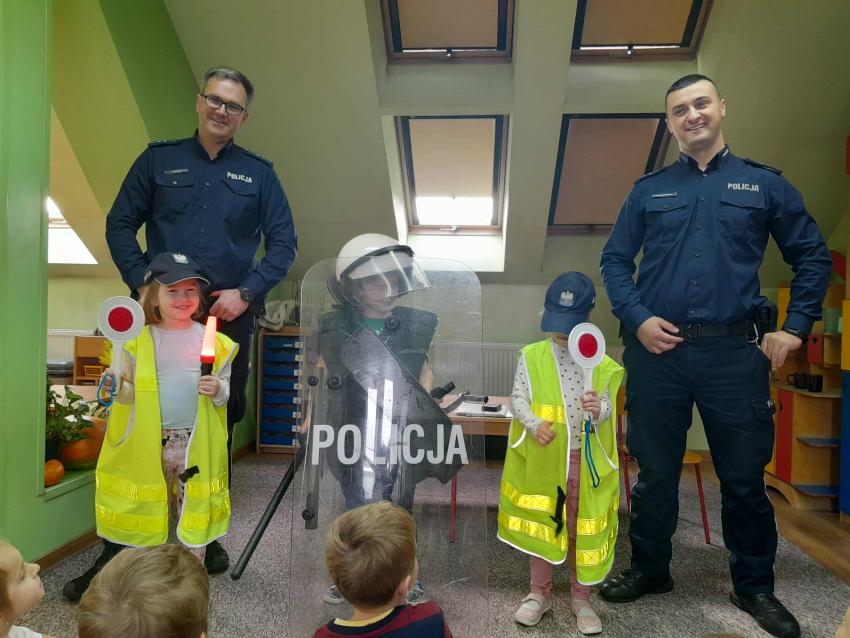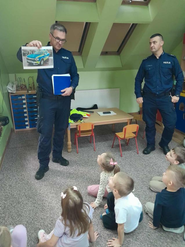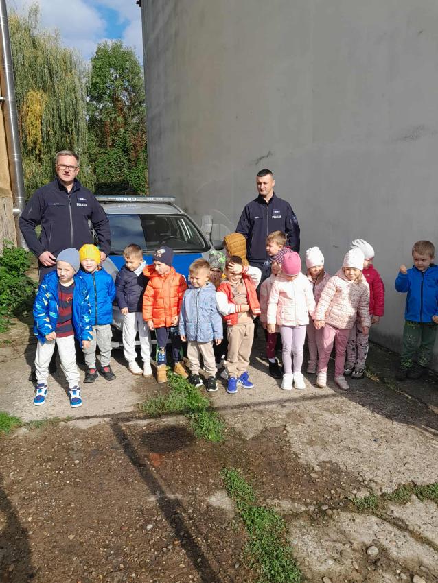 W naszym przedszkolu odbyło się spotkanie dzieci z Gr. III z funkcjonariuszami policji. Podczas wizyty policjanci opowiedzieli o swojej pracy oraz przypomnieli dzieciom najważniejsze zasady bezpieczeństwa: zarówno na drodze, jak i w codziennych sytuacjach. Przedszkolaki miały także okazję zobaczyć z bliska policyjny wóz, a nawet wsiąść do środka. Na zakończenie spotkania każdy uczestnik otrzymał drobny upominek od przybyłych gości. Było to bardzo ciekawe i pouczające wydarzenie, które na długo zostanie w pamięci dzieci. Dziękujemy za wizytę:)