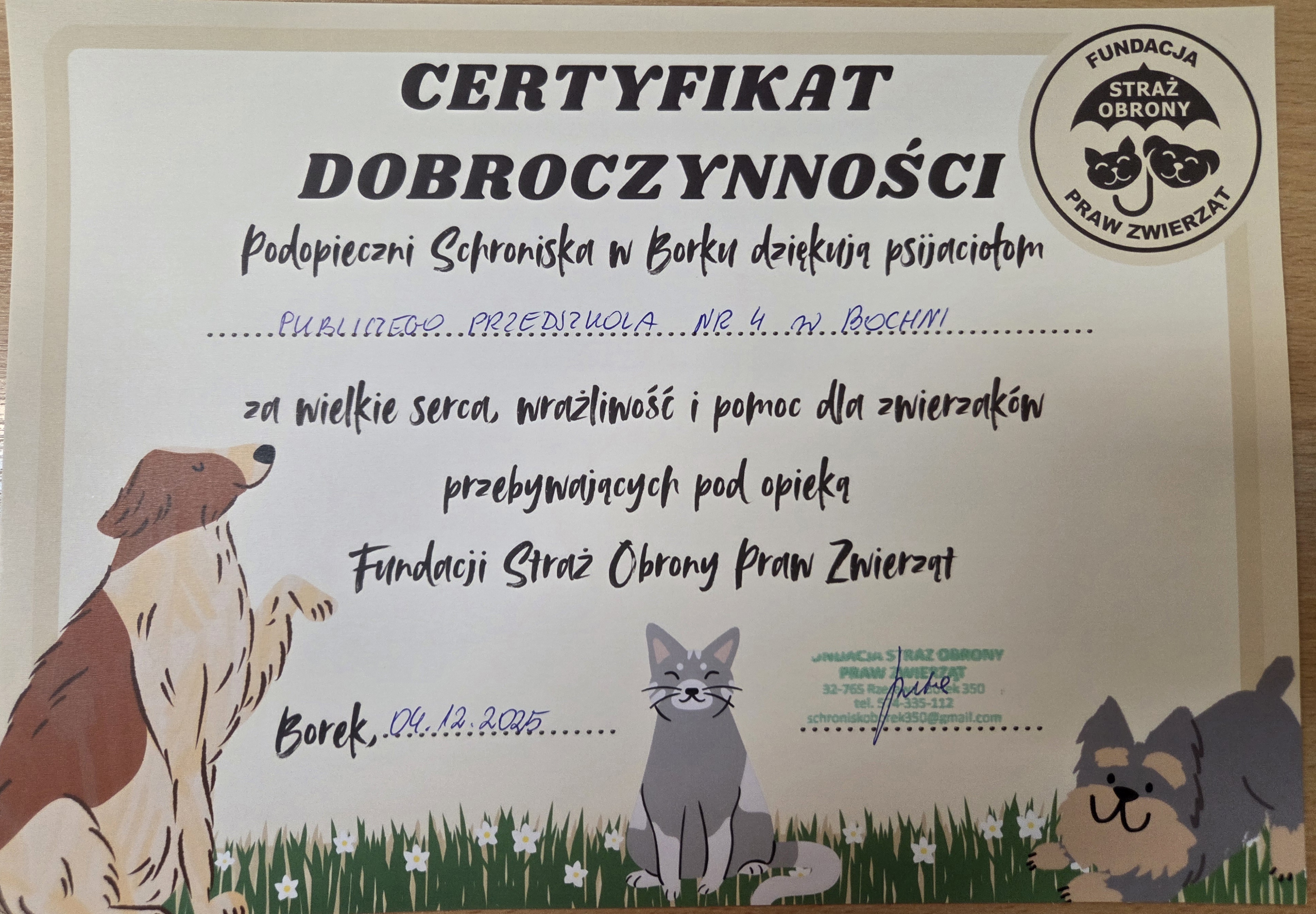 Certyfikat Dobroczynności od Schroniska w Borku.