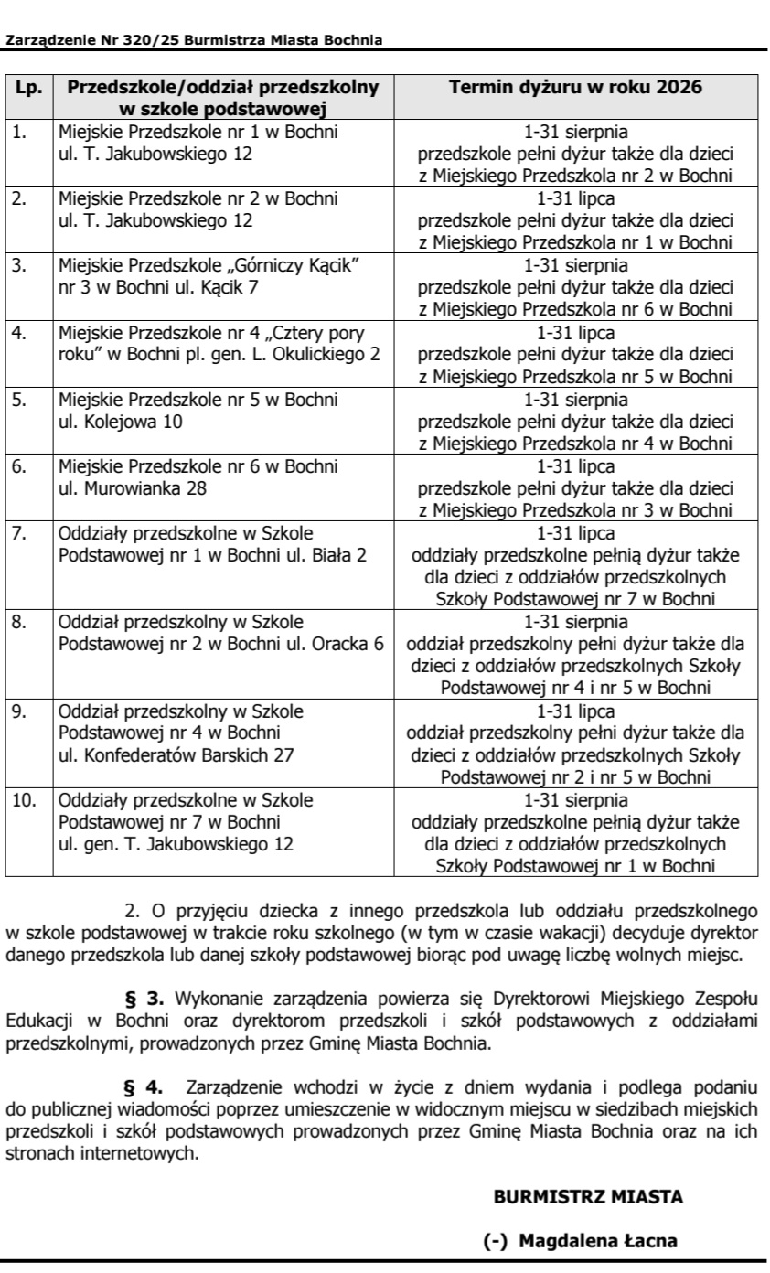 natomiast od 01.08.2024r. do 31.08.2024r. dyżur dla w/w dzieci będzie pełnić Miejskie Przedszkole nr 5 w Bochni.